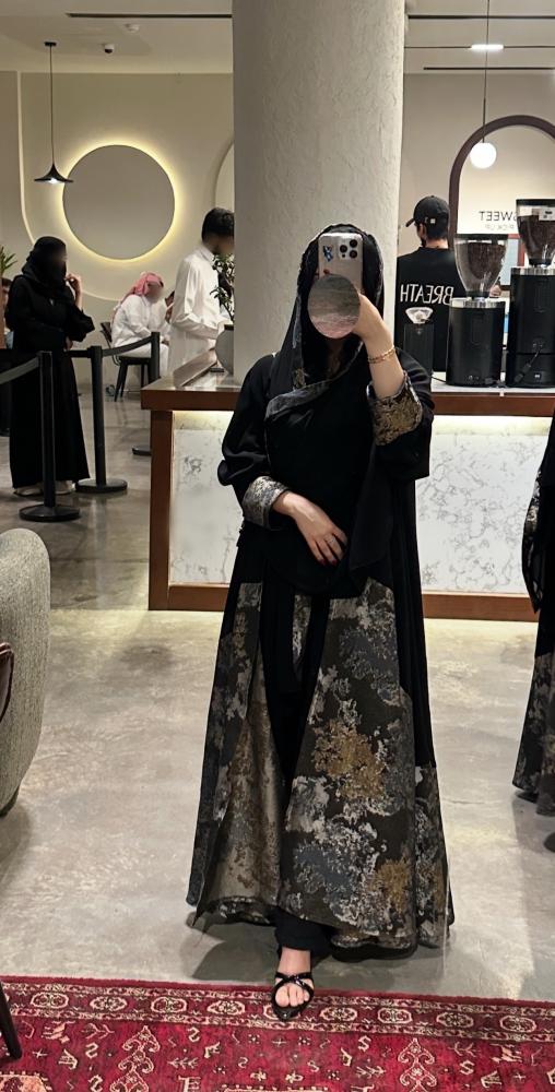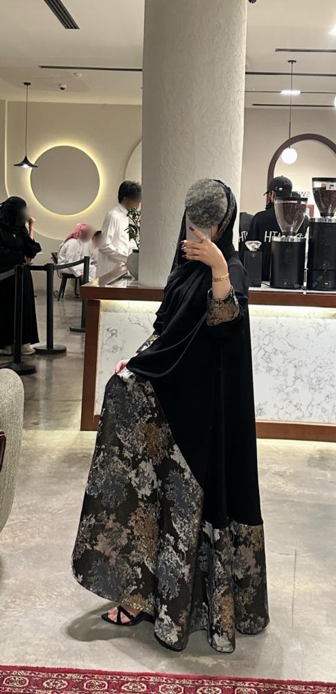 عباية سوداء مطعّمة بقماش مزخرف فاخر بألوان هادئة تضيف لمسة رقي وتميّز.